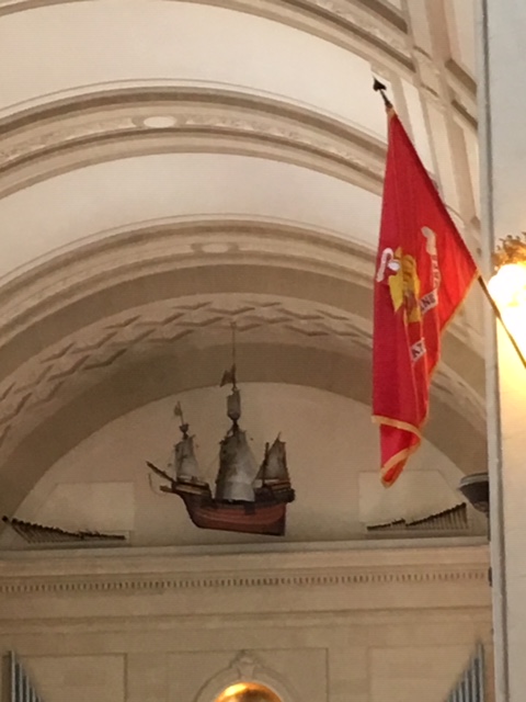 This is looking towards the back of the sanctuary of the Chapel. Notice the USNA blue railings. The cushions of the pews are a matching navy. To the very back and towards the ceiling, you'll see the mounted Seabees Ship. |